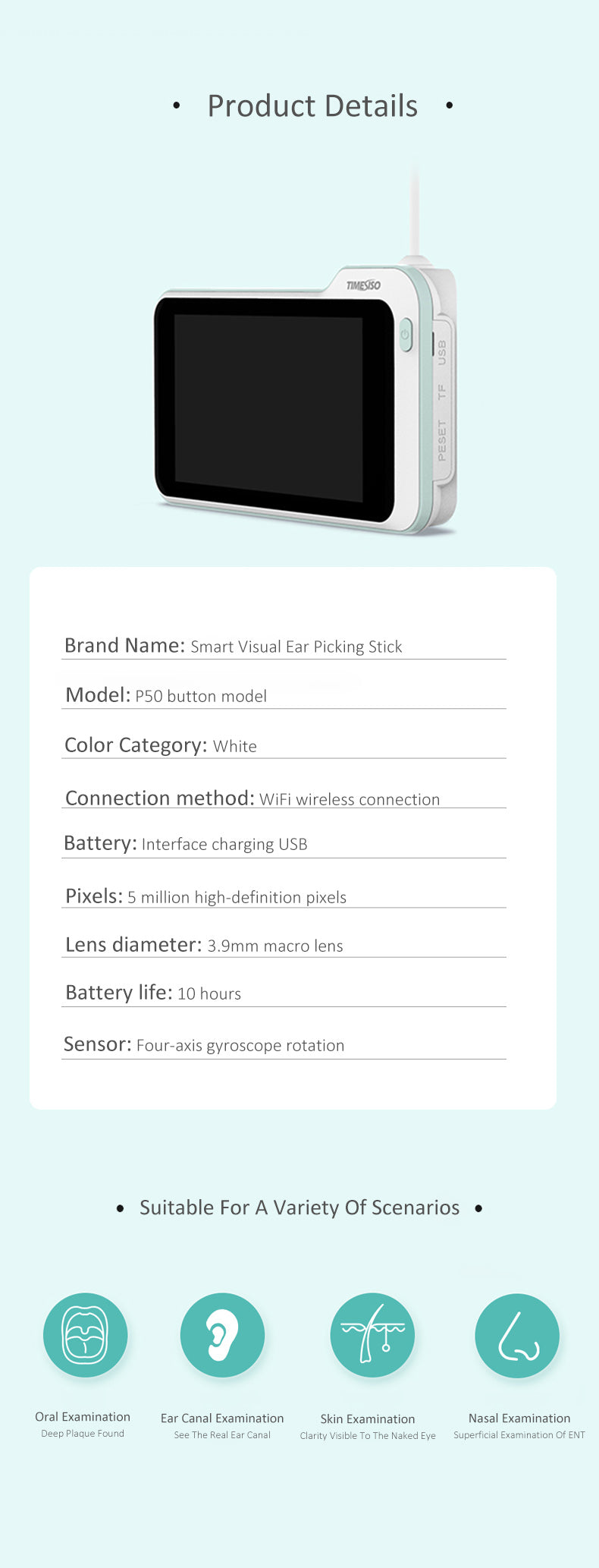 > Multifunctional Otoscope: This ear cleaning camera also works well for your pet (dogs, cats and more). And it's a great inspection camera for eyes, nose, oral, skin, and more.
